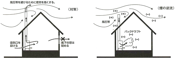 また、高気密住宅では燃焼空気が供給されにくいので、部屋の空気が薄くなり、煙突から外気が入り込もうとする為、煙が戻ってしまいます。